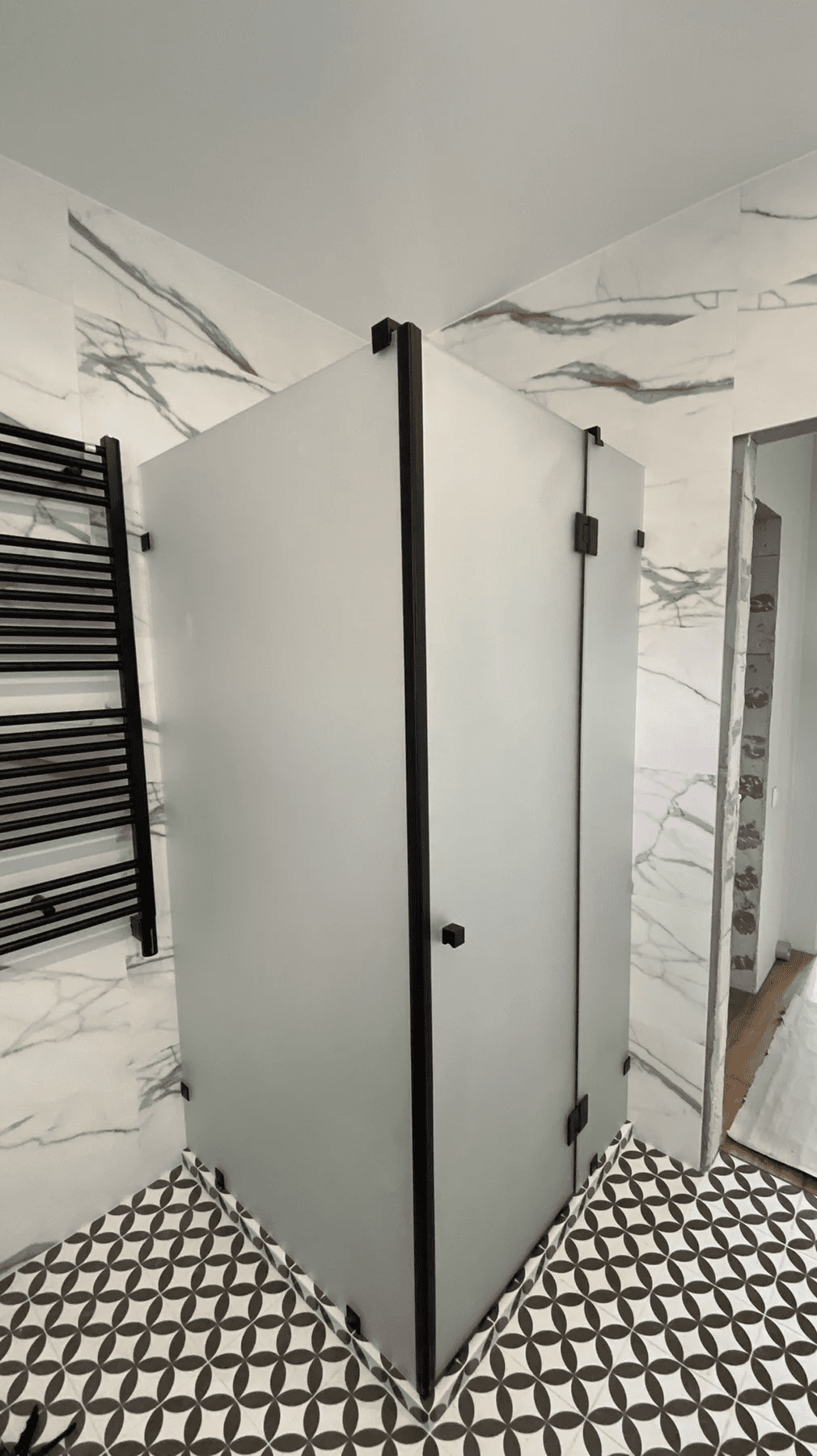Самая простая и быстрая в монтаже дверь — распашная. Ей нужно пространство, чтобы открыться, но обычно перед самым входом в душ ничего и не стоит, так что такие двери пользуются большой популярностью.