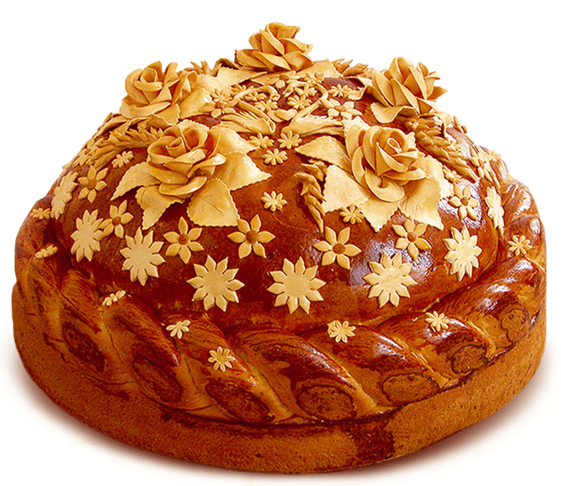 Традиционным символом свадьбы является каравай — обрядовый хлеб. Его выпекают специально отобранные старшие по возрасту женщины. Только те, у которых была счастливая семейная жизнь. Каравай украшают барвинком и калиной. Ибо барвинок символизирует вечную любовь, а калина — материнство. Во время праздничного застолья все гости делятся караваем, что олицетворяет единство и благополучие новой семьи.